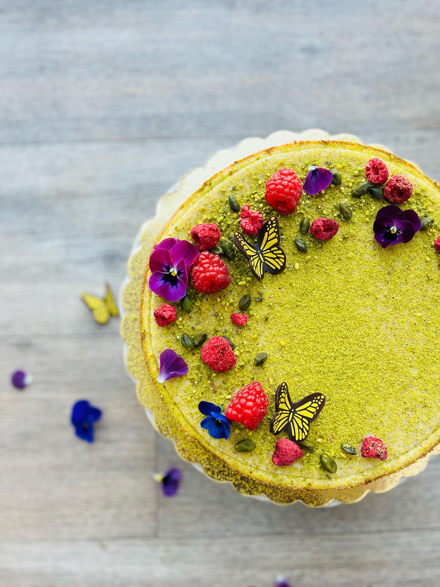 Velkonocny cheesecake pistacia&malina v krasnom machovom jarnom zdobeni /cena: 50€