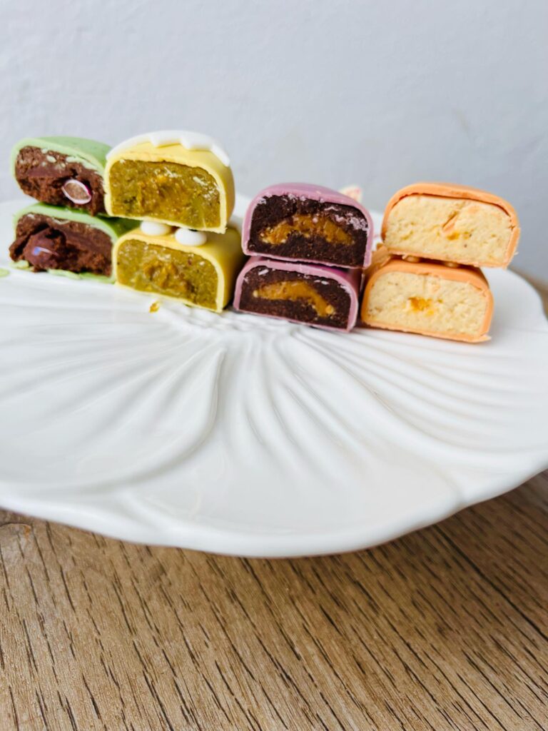 – macarons kropenate v 4 prichutiach : mliecna coko, slany karamel, marhula, jahoda